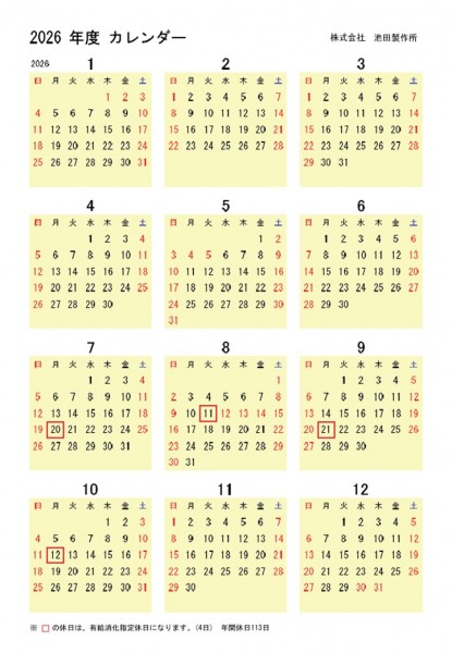 2026年、弊社営業日カレンダーが完成しましたので御報告致します。